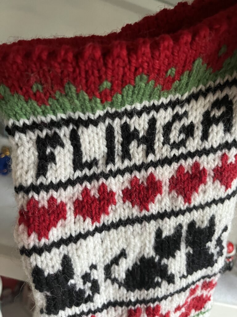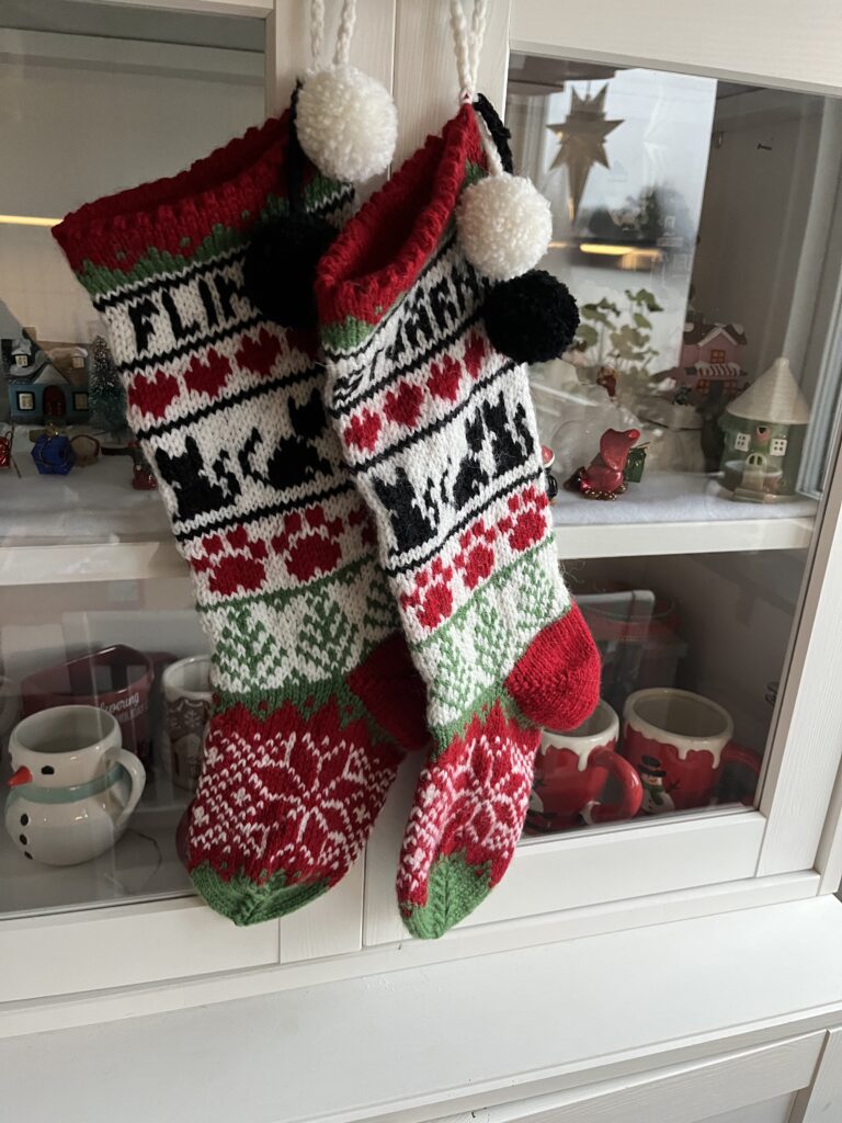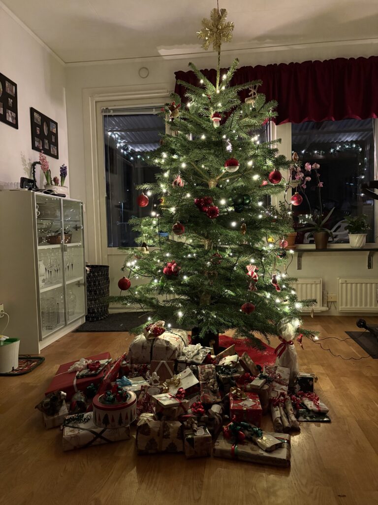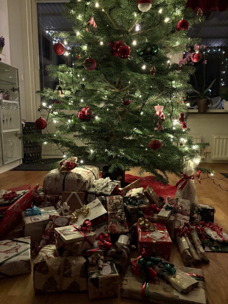 På morgonen smög jag upp och började lägga ut alla julklappar under granen. Förr om åren har jag gjort det kvällen innan men då har vi kunnat ha stängt till vardagsrummet (vill absolut inte riskera att någon av katterna äter snöre) men efter lite ommöblering så skulle det innebär att katterna bara hade haft halva huset och det hade absolut funkat men ena sover hos dottern och de hade hon inte kunnat göra=katastrof! Så la ut de på morgonen. När jag ändå var uppe och hostade på natten så la jag några småsaker i Moas julstrumpa. Förr om åren har jag kunnat göra det på kvällen när hon somnat men numera somnar hon efter mig… 🙂